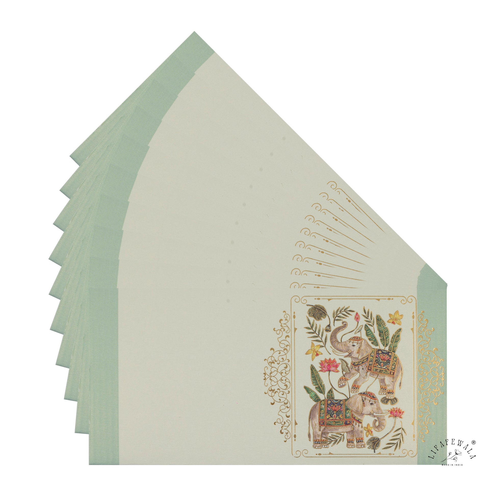 Crafted from premium metallic paper with a subtle scented aroma, these envelopes exude elegance and charm. The intricate gold foil elephant motif represents strength, prosperity, and good fortune — making it perfect for weddings, festivals, and special occasions.
